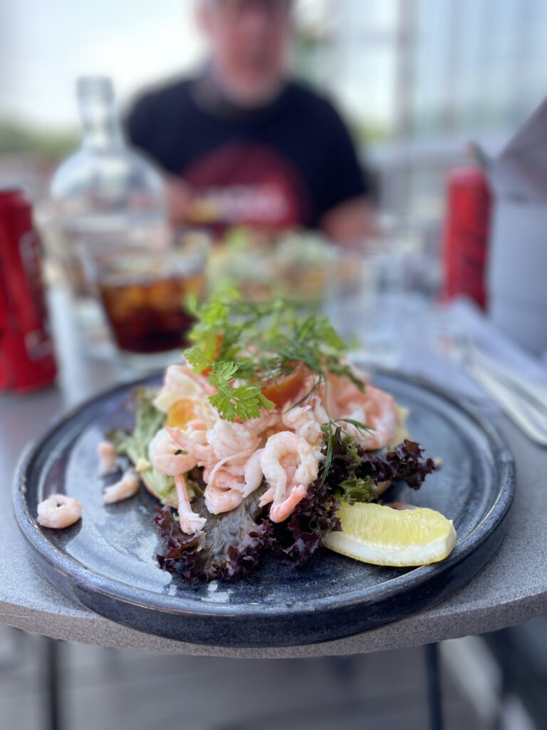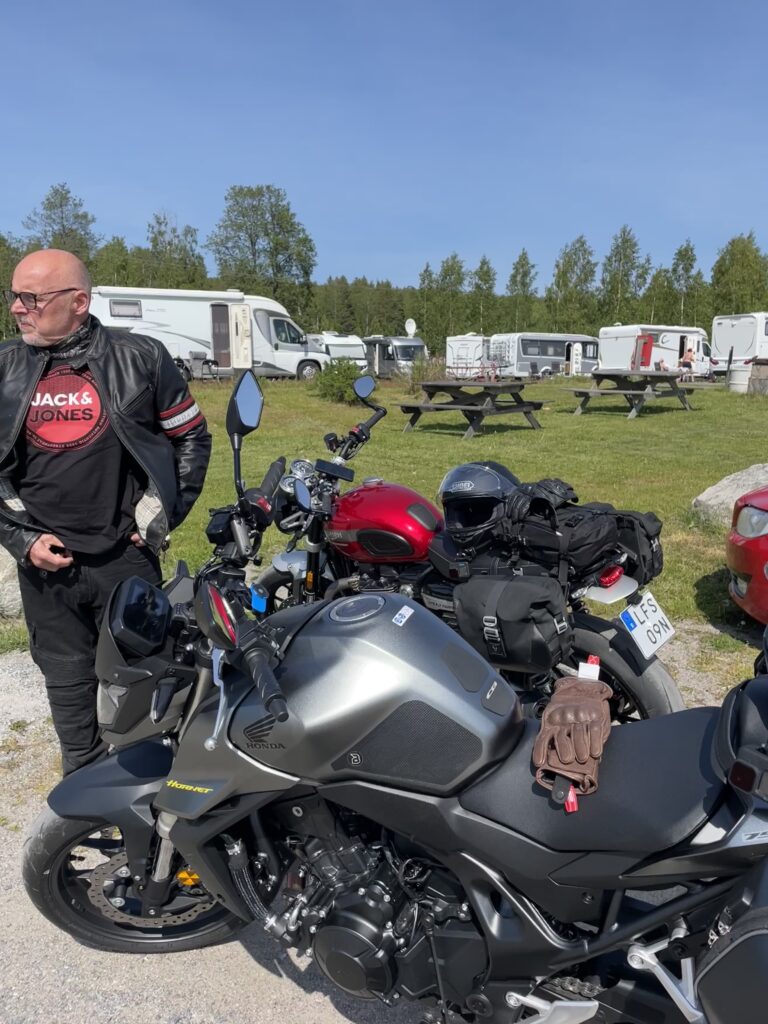 Ett så stort ögonblick förtjänar förstås något extra, så jag hade planerat en liten överraskning åt honom: en hemlig mini mc-semester. Vi rullade norrut valde de lite mindre vägarna istället för att köra på E4:an. Efter vägen stannade vi vid Borka Brygga som ligger strax utanför Enånger, där vi tog en lunchpaus. Restaurangen ligger precis vid havet, och härligt utsikt över vattnet. Finns en camping i alldeles nära anslutning, och precis vid restaurangen även plats för en del husbilar.